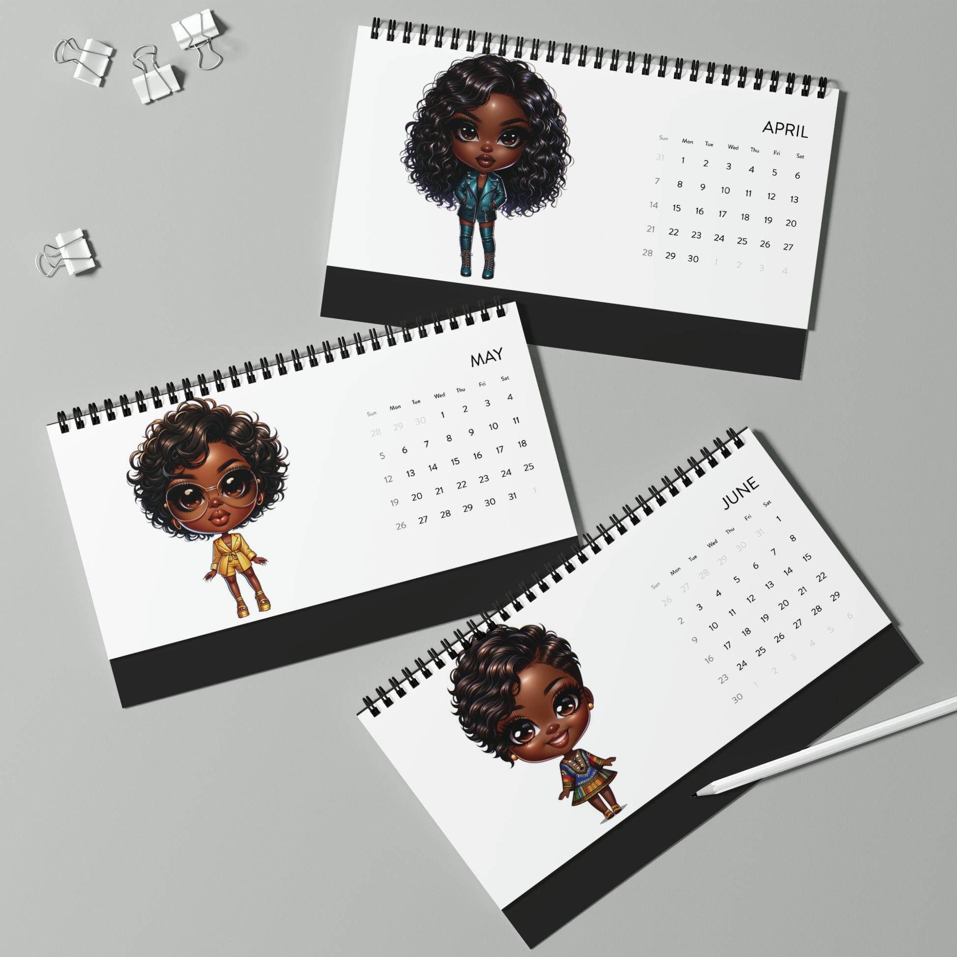 Featuring 12 beautifully illustrated months, each page showcases a unique African-American chibi woman, exuding confidence and grace in various professional, sophisticated, and urban outfits. From glamorous makeup to diverse hairstyles, these chibi fashionistas are a celebration of style, diversity, and character.