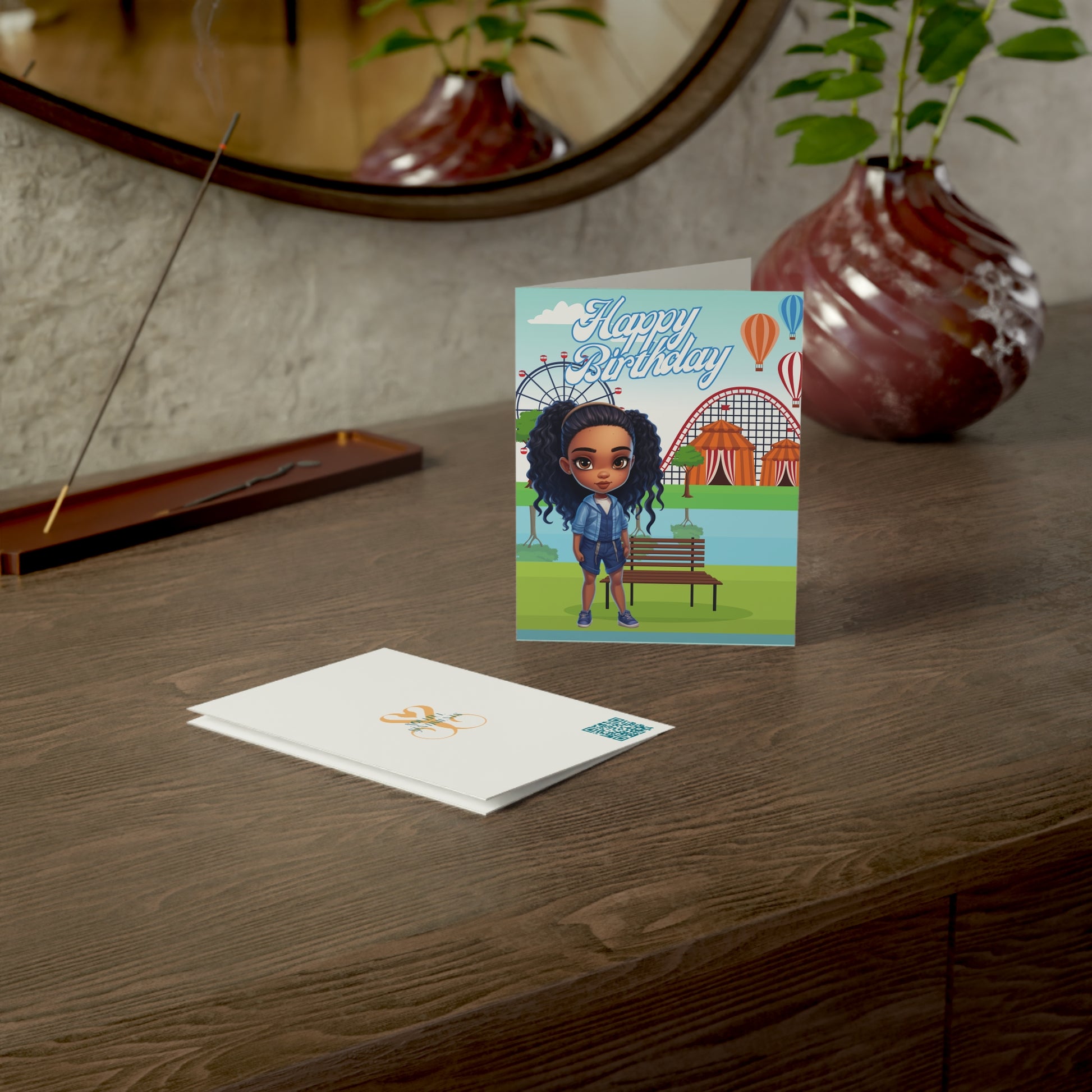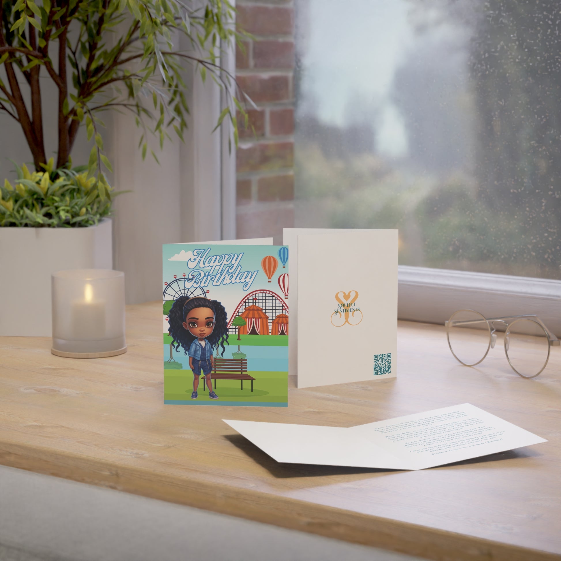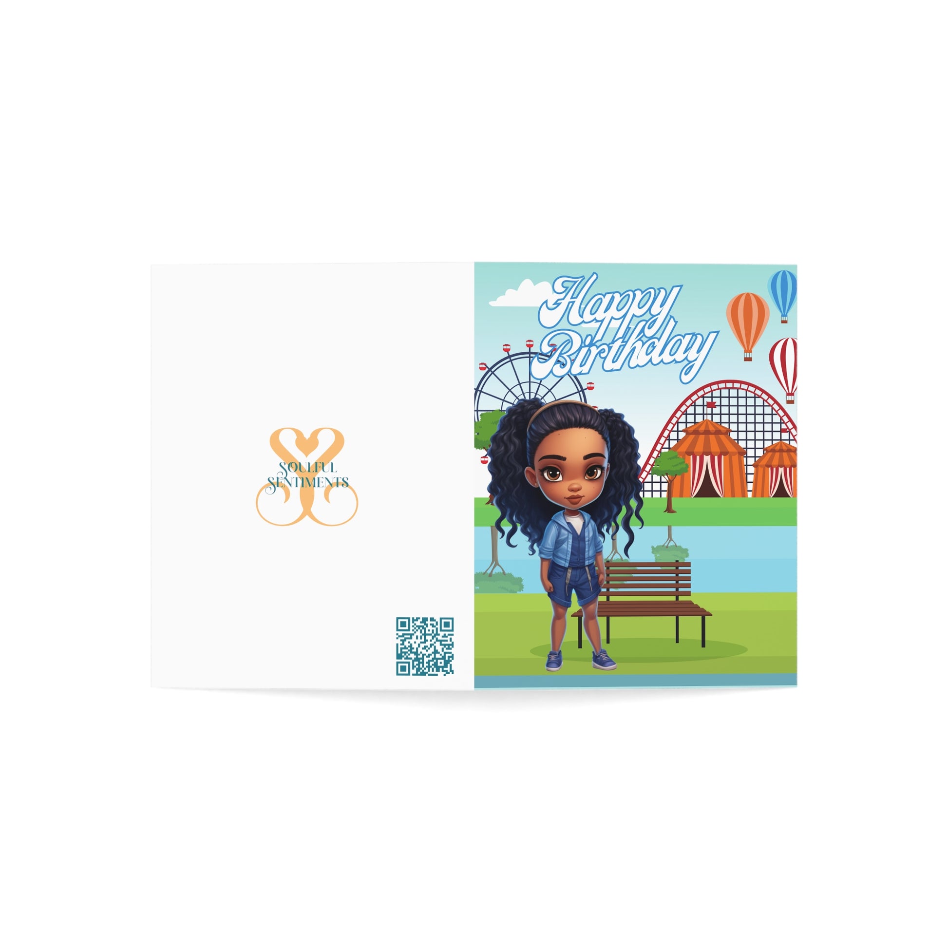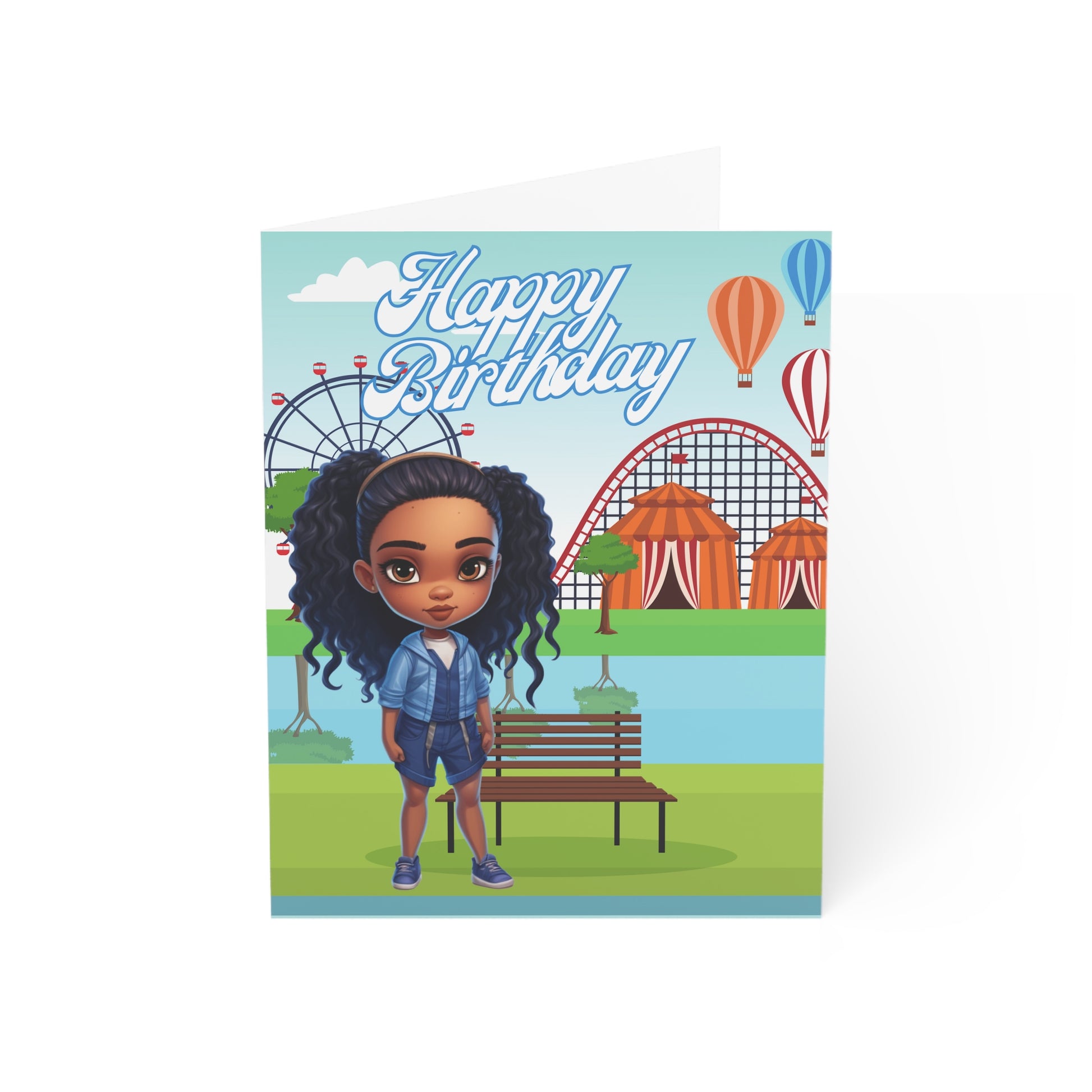 With a vibrant amusement park as the backdrop, complete with bright colors and exhilarating rides, this card sets the stage for an unforgettable birthday bash. Front and center, we've got a fabulous African American girl, ready to embrace the joy and adventure that awaits her on her special day.