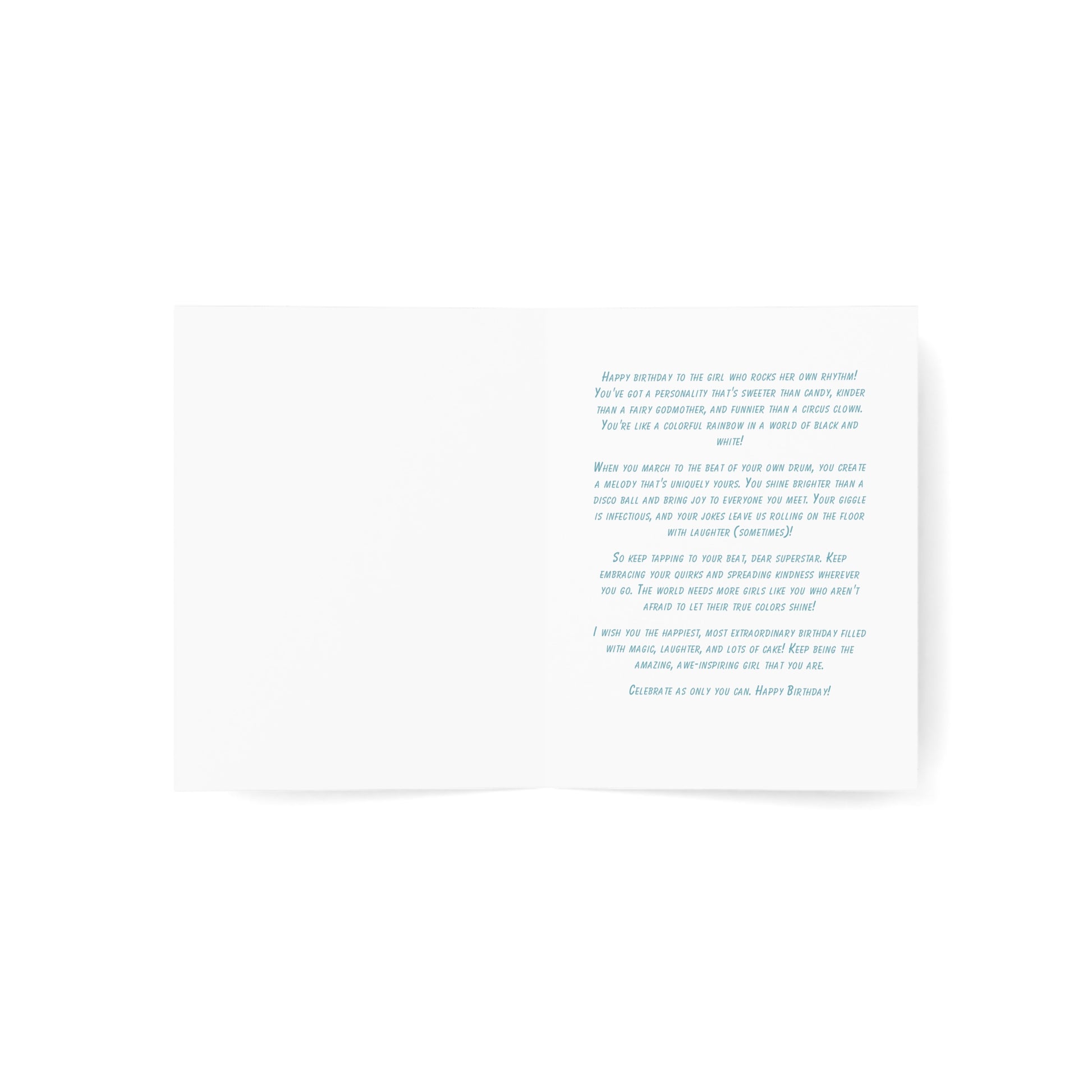 Inside, you'll find a playful message that's as awesome as the receiver! It's a virtual high-five, a fist bump of excitement, and a big warm hug all rolled into one. This card is here to remind you that their birthday is all about embracing the thrill of being a girl who shines with unique brilliance.