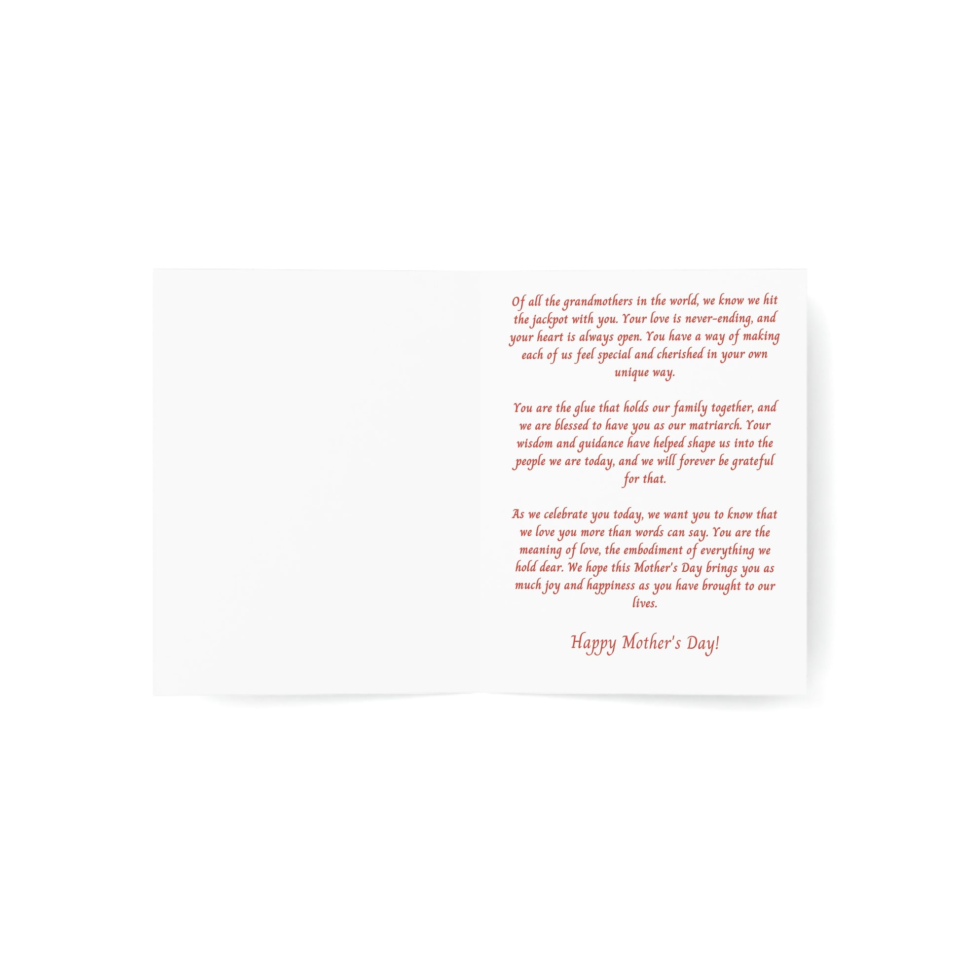 This Mother's Day, honor the special woman who has always been there for you with a beautiful greeting card designed specifically for grandmothers. Featuring a heartfelt message that expresses your love and appreciation, this card is the perfect way to show your grandmother just how much she means to you. With its beautiful design and touching words, it's sure to become a cherished keepsake that your grandmother will treasure for years to come. Give her the gift of your love this Mother's Day with our beautiful greeting card for grandmothers.
