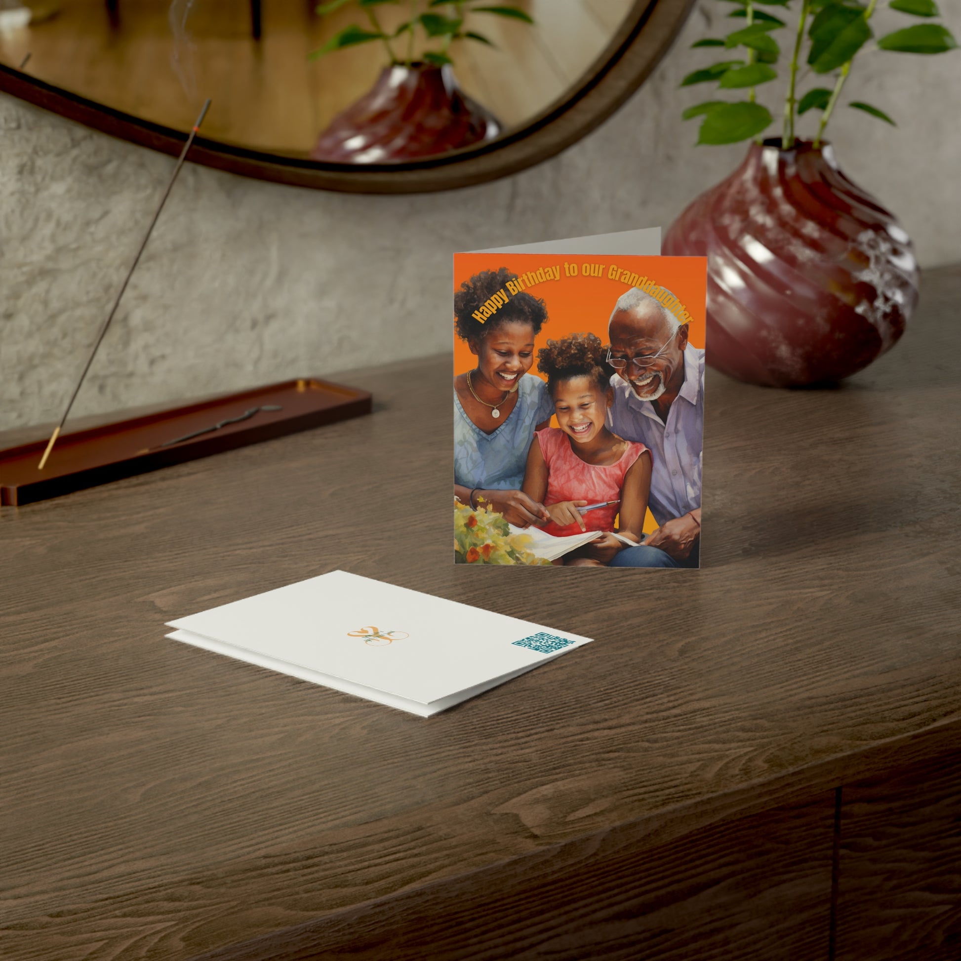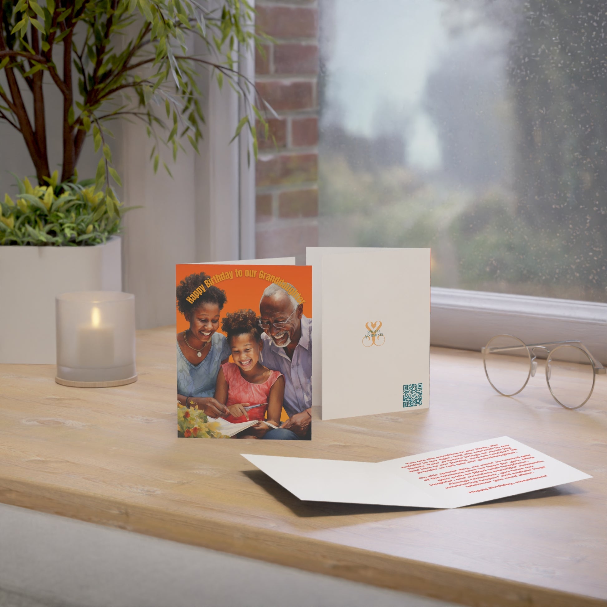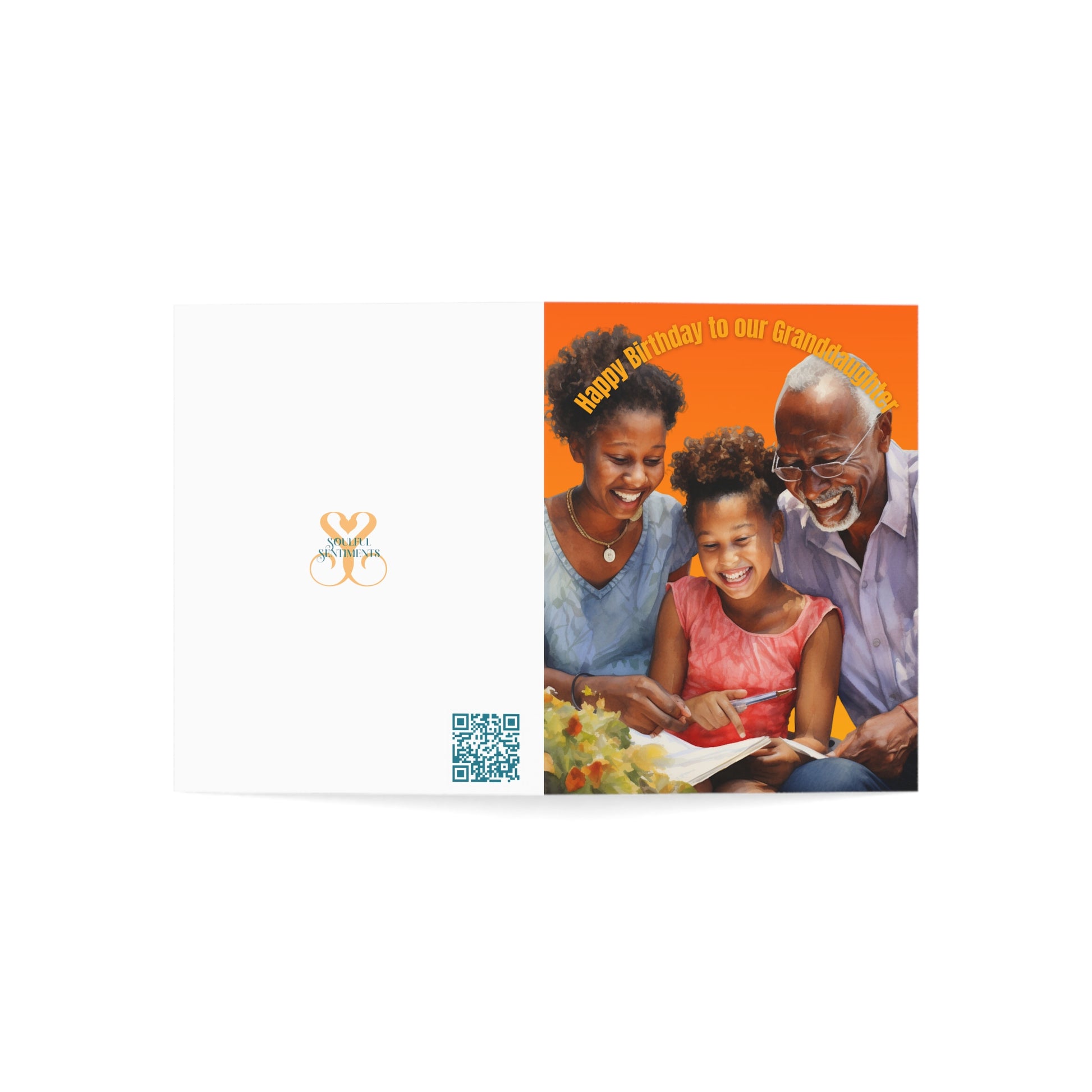 This delightful card features a vibrant and warm design, filled with the love shared between grandparents and their granddaughter. The front cover proudly displays the words "Happy Birthday to Our Granddaughter," setting the tone for a joyful celebration.