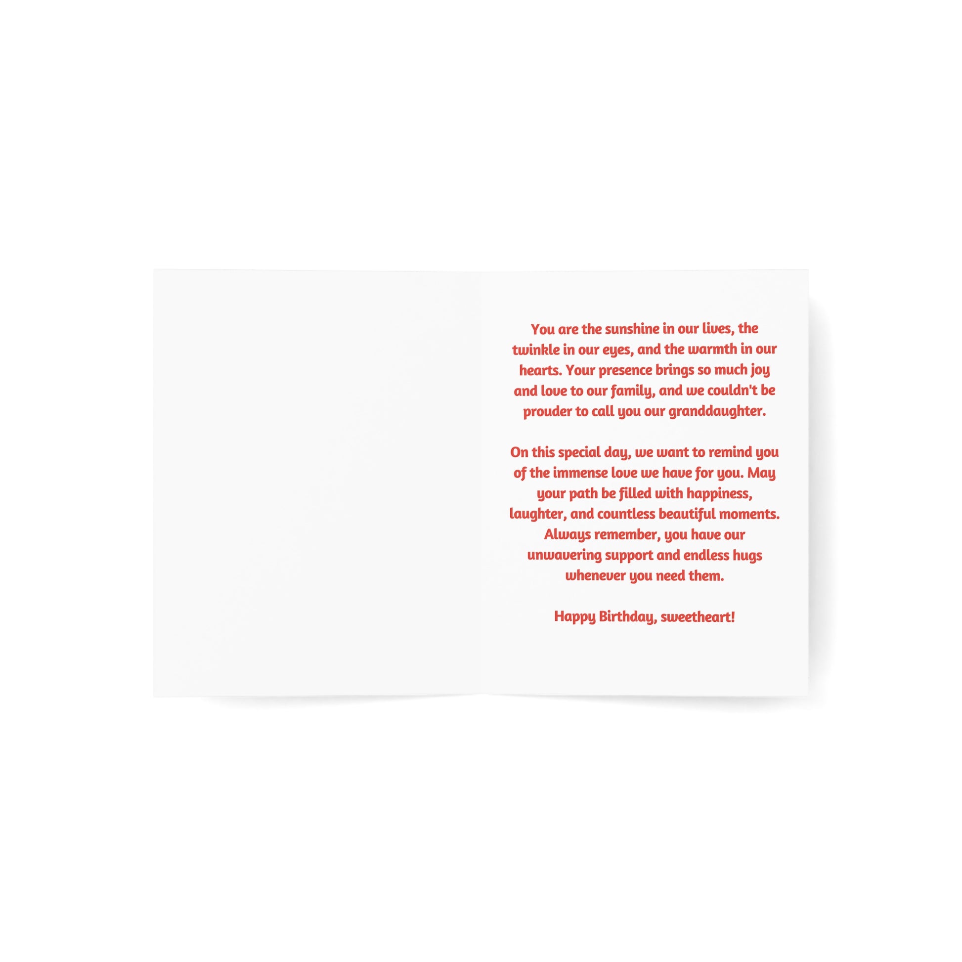 Celebrate your granddaughter's special day with our enchanting "Birthday Wishes for Our Granddaughter" Greeting Card, designed to bring a smile to her face and warm her heart on her birthday.