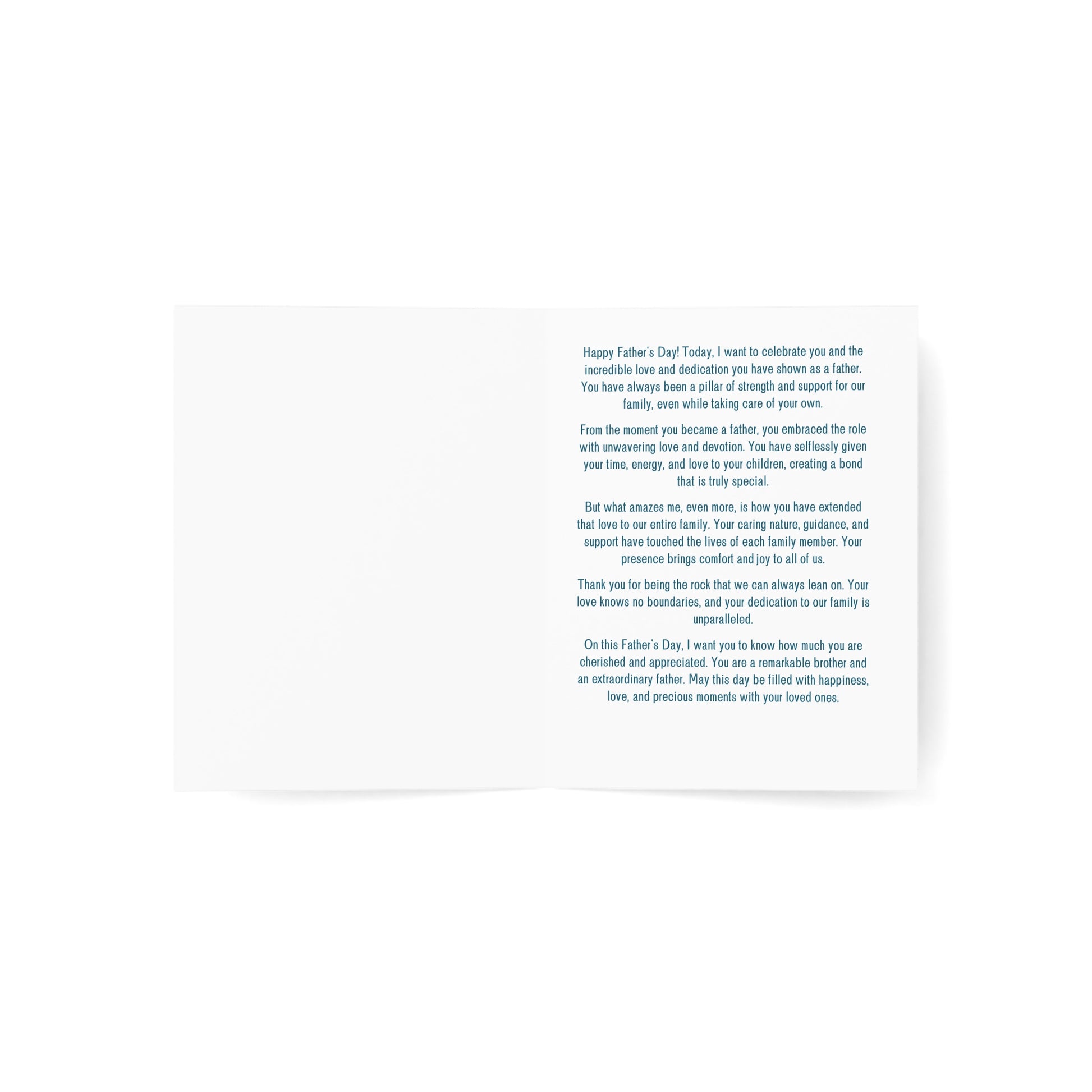 Choose our Father's Day greeting card to honor the incredible brother and father he is. With its unique design and heartfelt message, this card is a keepsake that will remind him of the special place he holds in your heart. Make this Father's Day unforgettable by celebrating the remarkable man who continues to inspire and uplift you. Order now and let your brother know just how much he means to you.