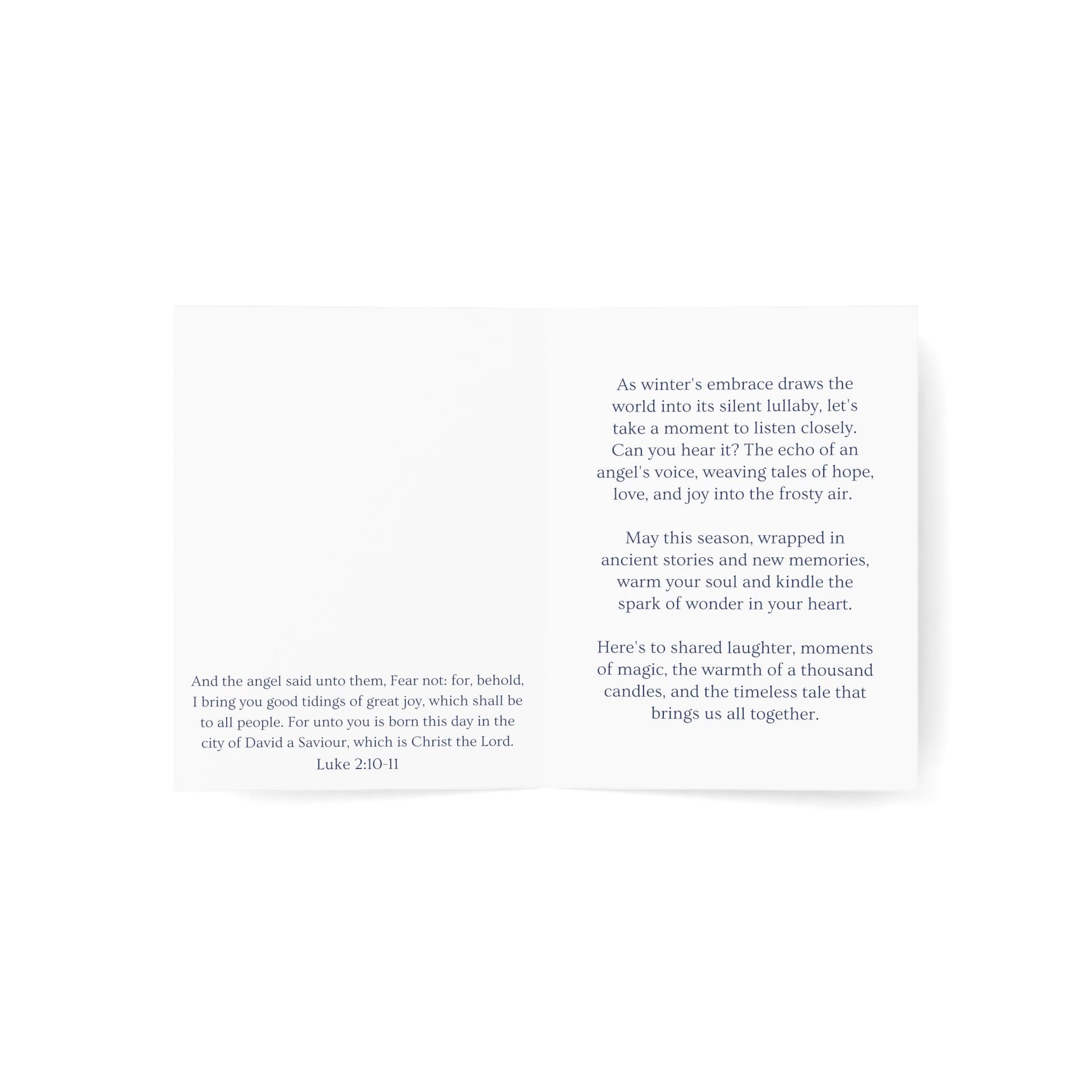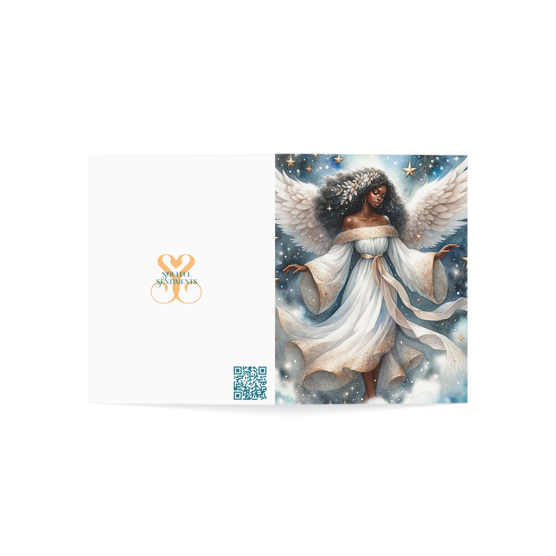 Embrace the radiant message of the season with our "Good News" Christmas card. Inspired by the divine proclamation in Luke 2:10-11, this card features a resplendent African American angel suspended amidst the soft embrace of clouds and the twinkling of dancing stars. Her serene presence captures the profound joy and hope of the sacred announcement, offering a touching reminder of the true essence of Christmas. Crafted with intricate detailing and set against a celestial backdrop, this card is more than just a greeting—it's an invitation to reflect1 on the miraculous wonders of the holiday. Send your loved ones a piece of heavenly good news wrapped in the beauty of this card.