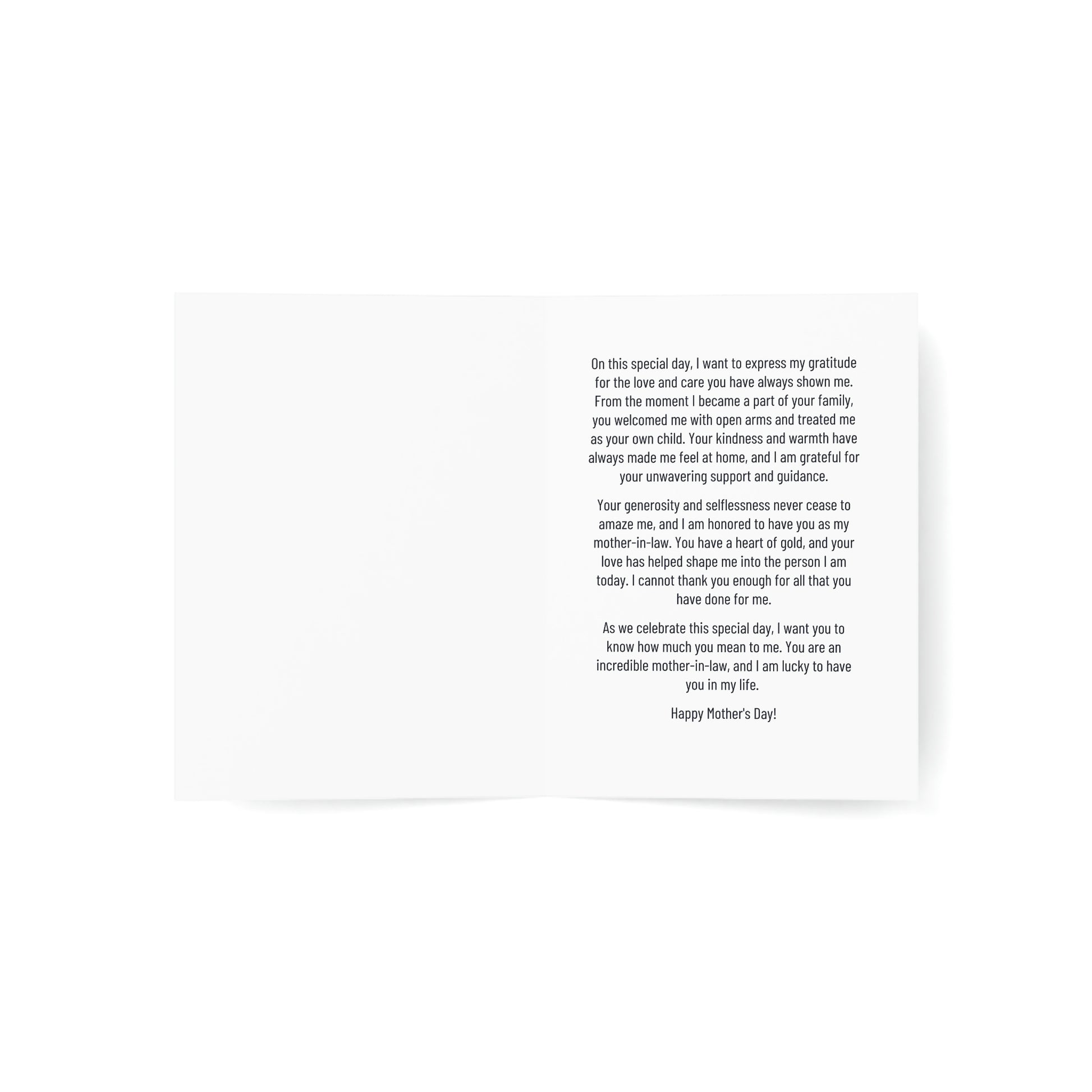 Celebrate Mother's Day in the most heartfelt way with this beautiful greeting card designed exclusively for daughters-in-law and sons-in-law. The card is a perfect way to express your gratitude and appreciation for the love and affection your mother-in-law has showered upon you, treating you like her very own child.