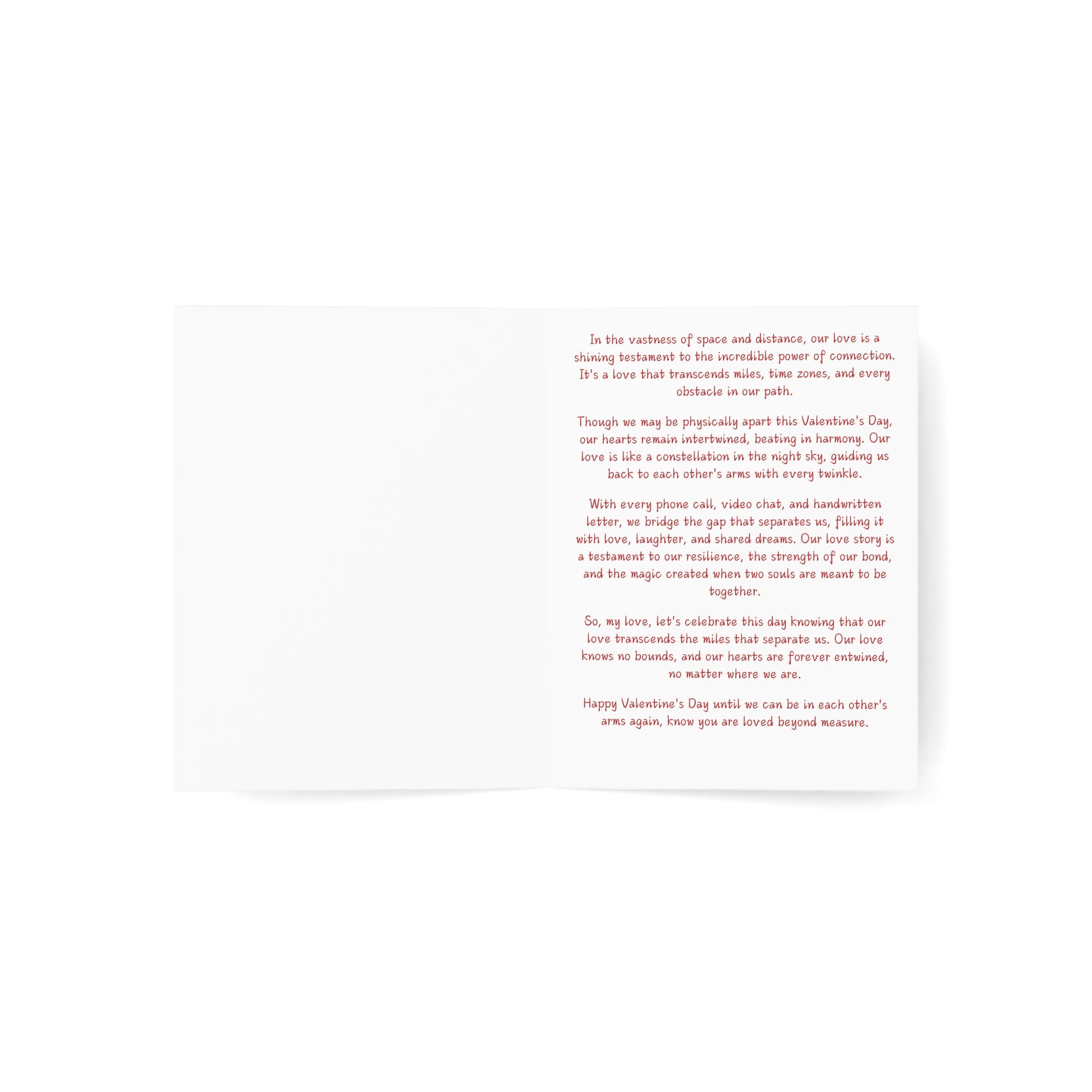 Inside this card, you'll find a message that dances with the sentiment of love that knows no limits. It's like a love letter from the heart, reminding you both that no matter the physical distance, your hearts remain forever intertwined.