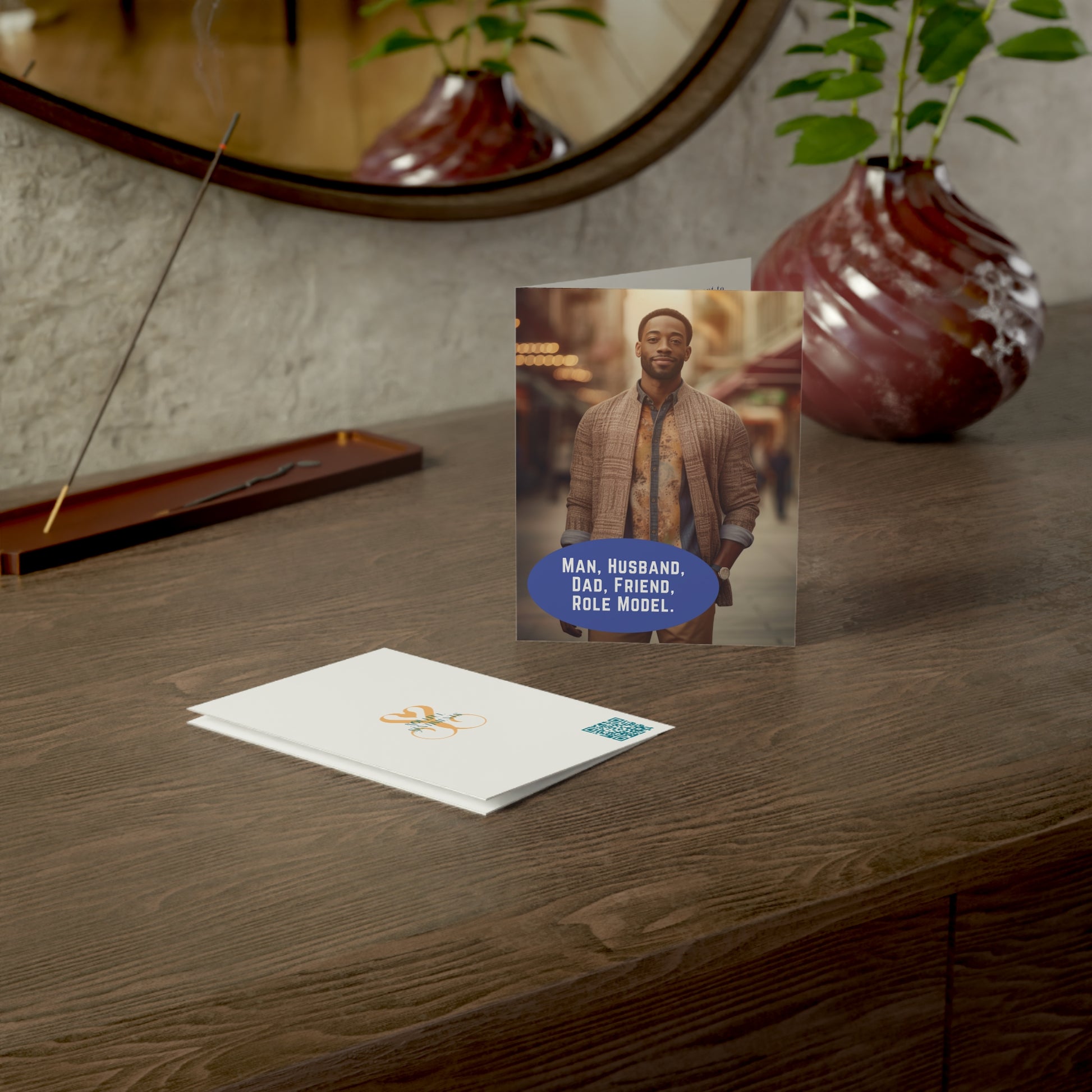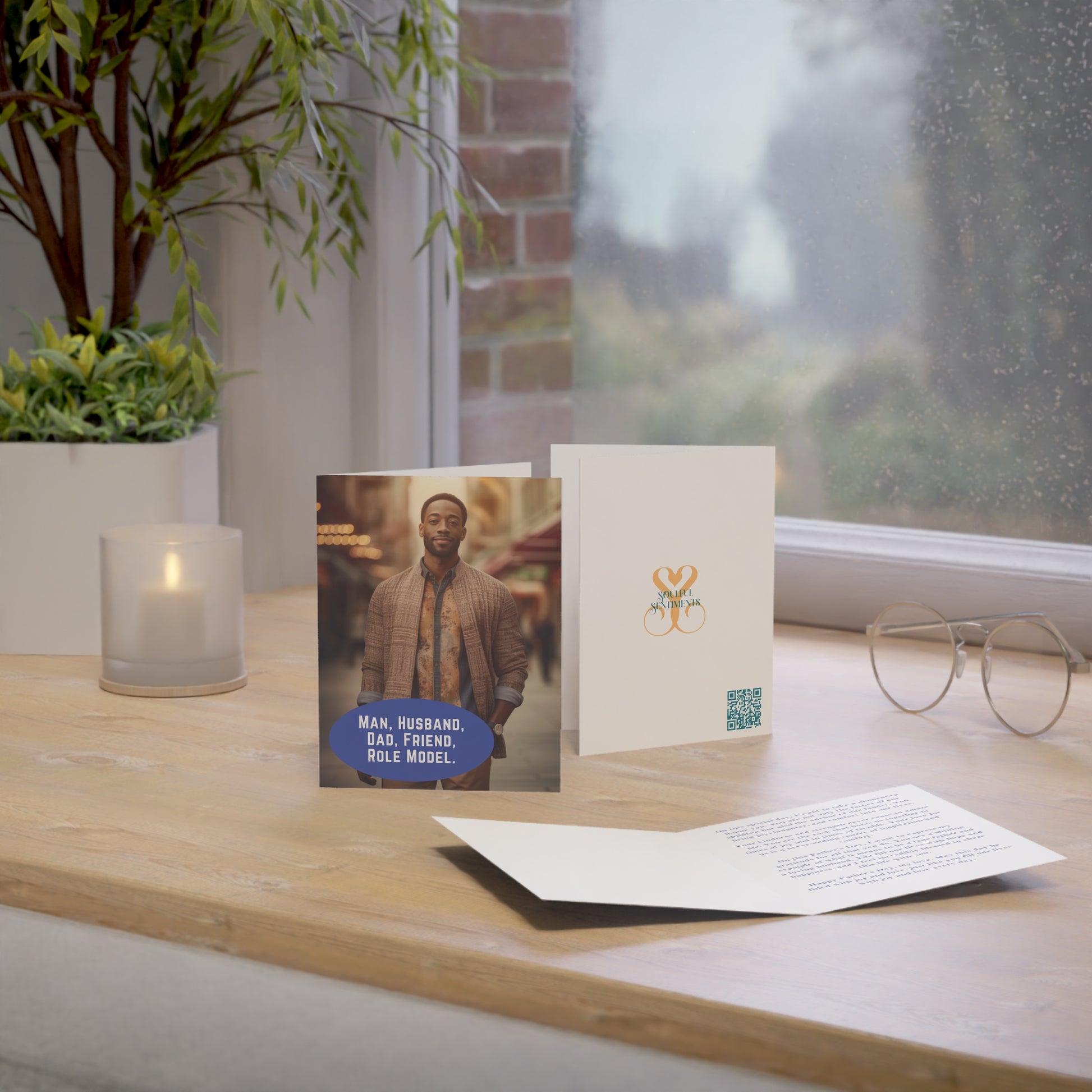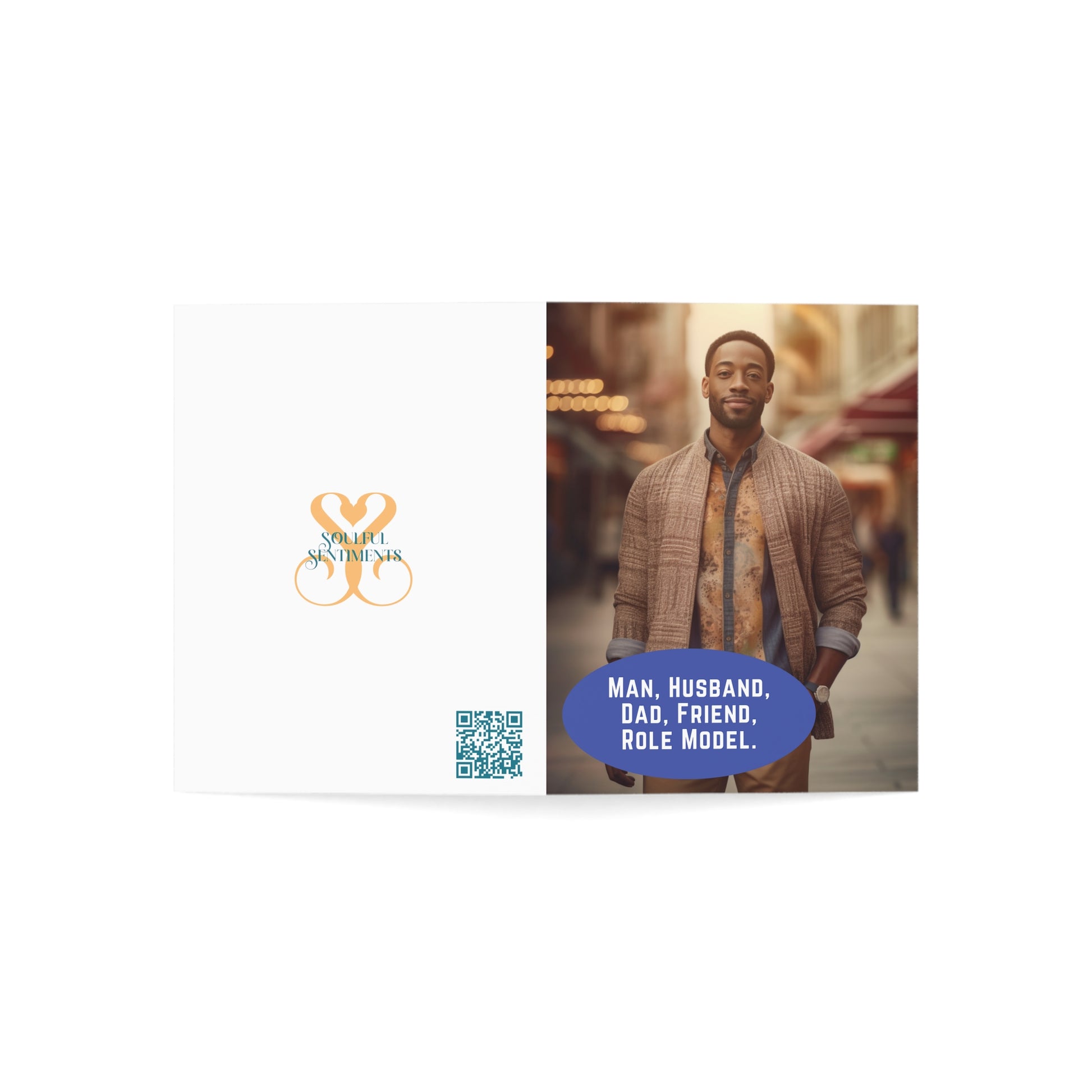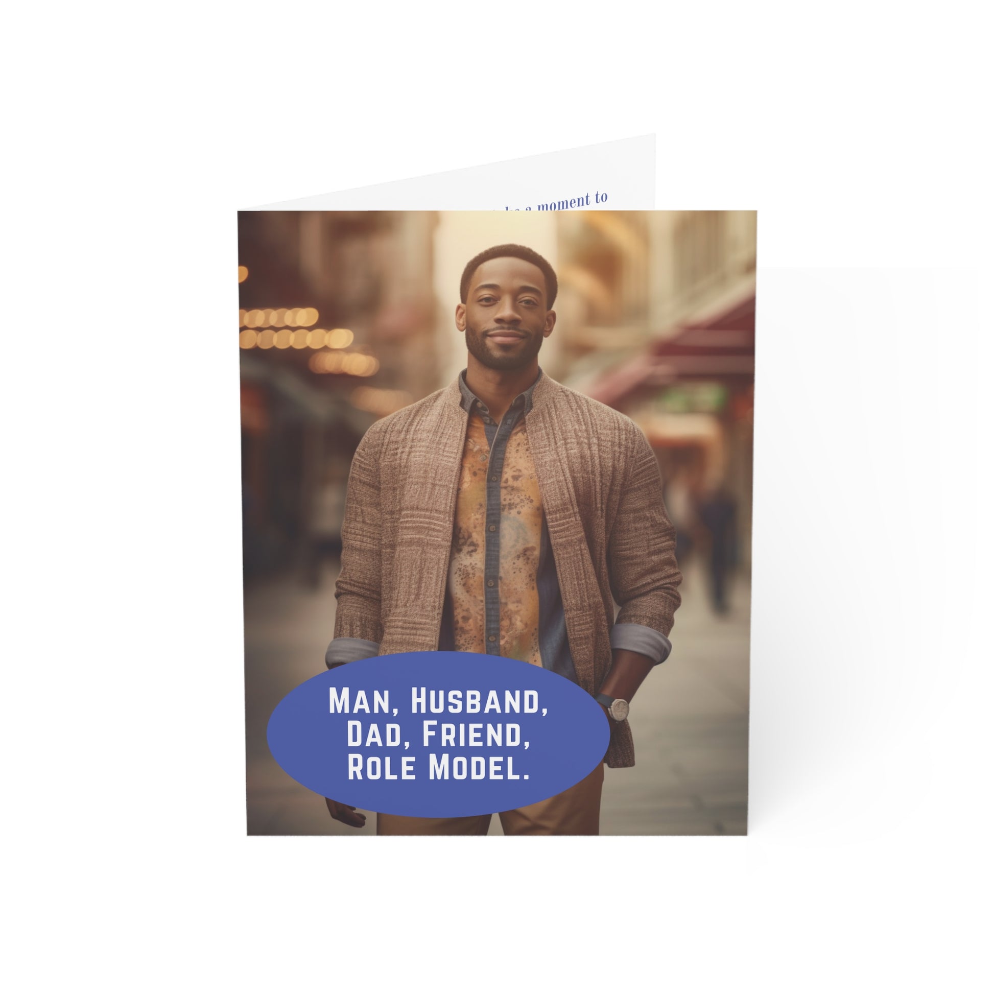 Celebrate the incredible man in your life with our unique and creative Father's Day greeting card. The outside of the card boldly declares "Man, Husband, Dad, Friend, Role Model," capturing the multifaceted essence of the one you hold dear. This card is more than just a piece of paper; it's a heartfelt tribute to the remarkable roles he plays.