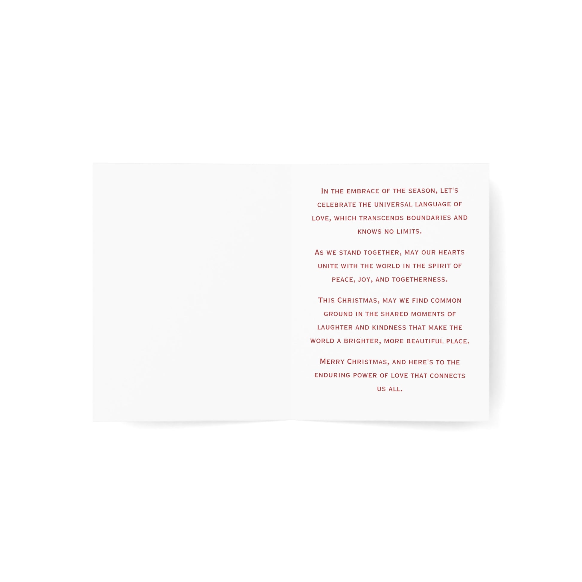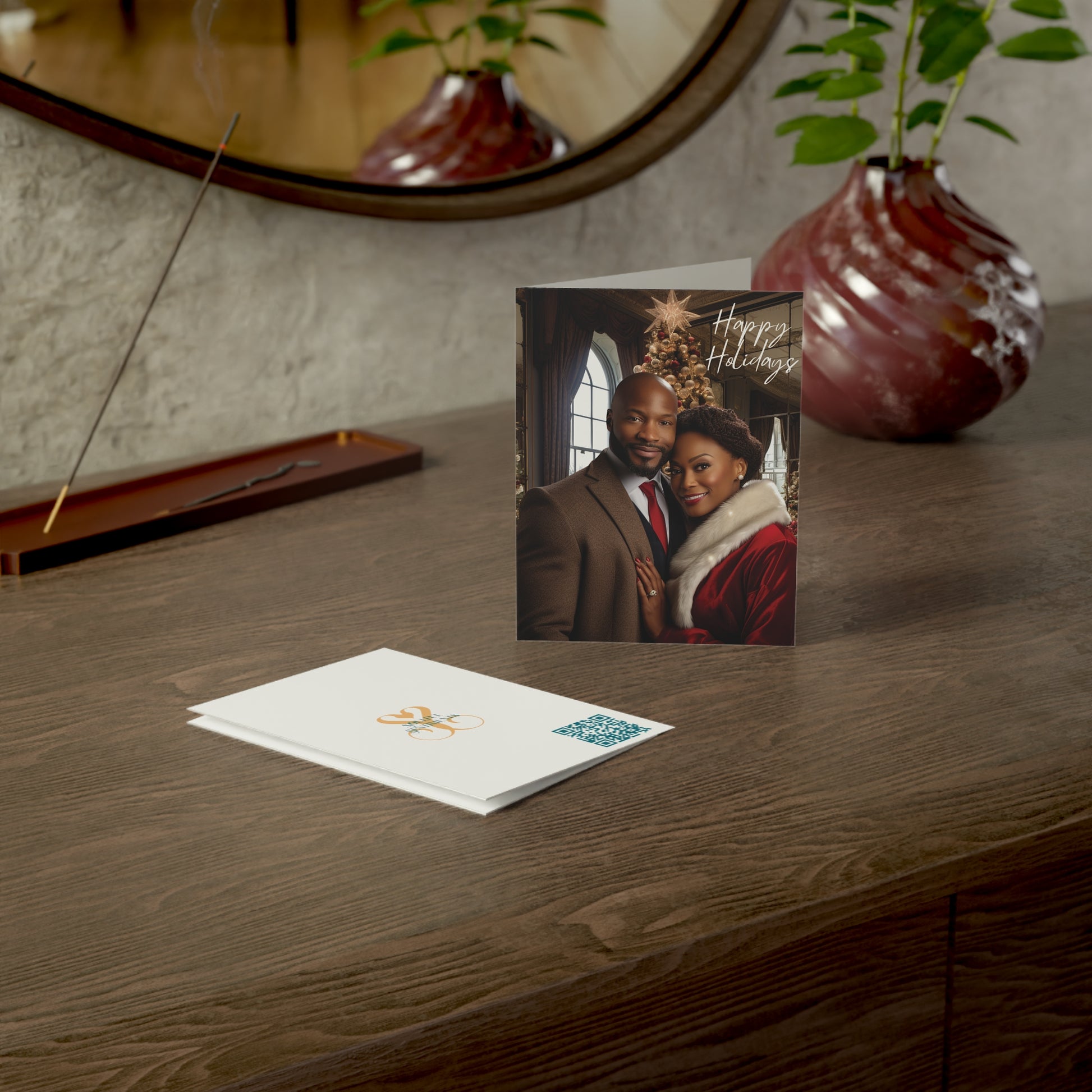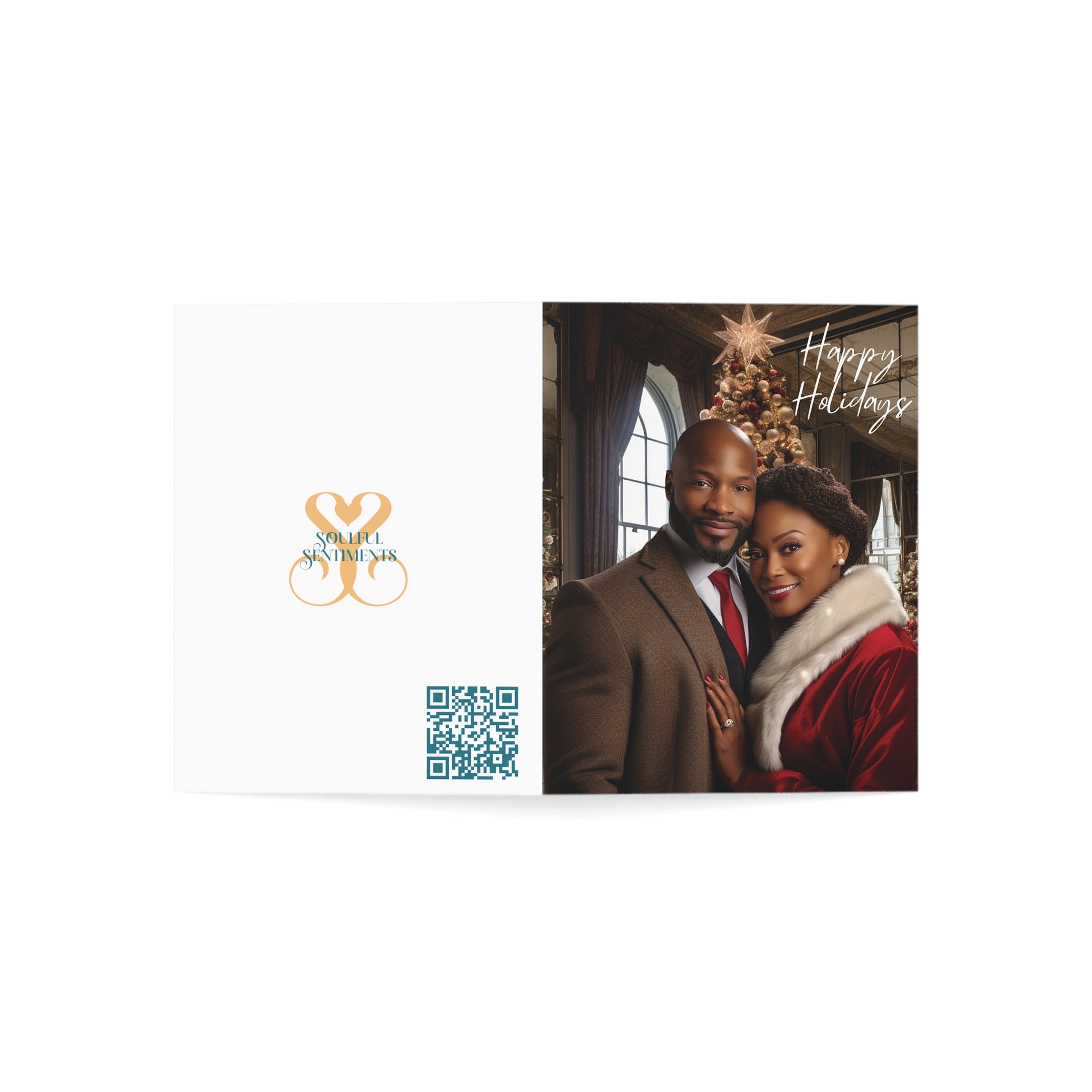 Celebrate the season's heartfelt moments with our "Reflections of Christmas Joy" Christmas card. On the front, a loving couple — he in a sharp suit, and she in a festive Santa jacket — share a tender embrace, symbolizing the cherished connections of the holiday season. Set against the backdrop of a classic living area, a beautifully decorated Christmas tree stands tall, its glowing splendor mirrored, creating a magical and intimate atmosphere. Accompanied by the warm wishes of "Happy Holidays," this card seamlessly melds traditional charm with heartfelt emotion. Gift your loved ones a glimpse of the shared moments and reflections that make the season unforgettable.