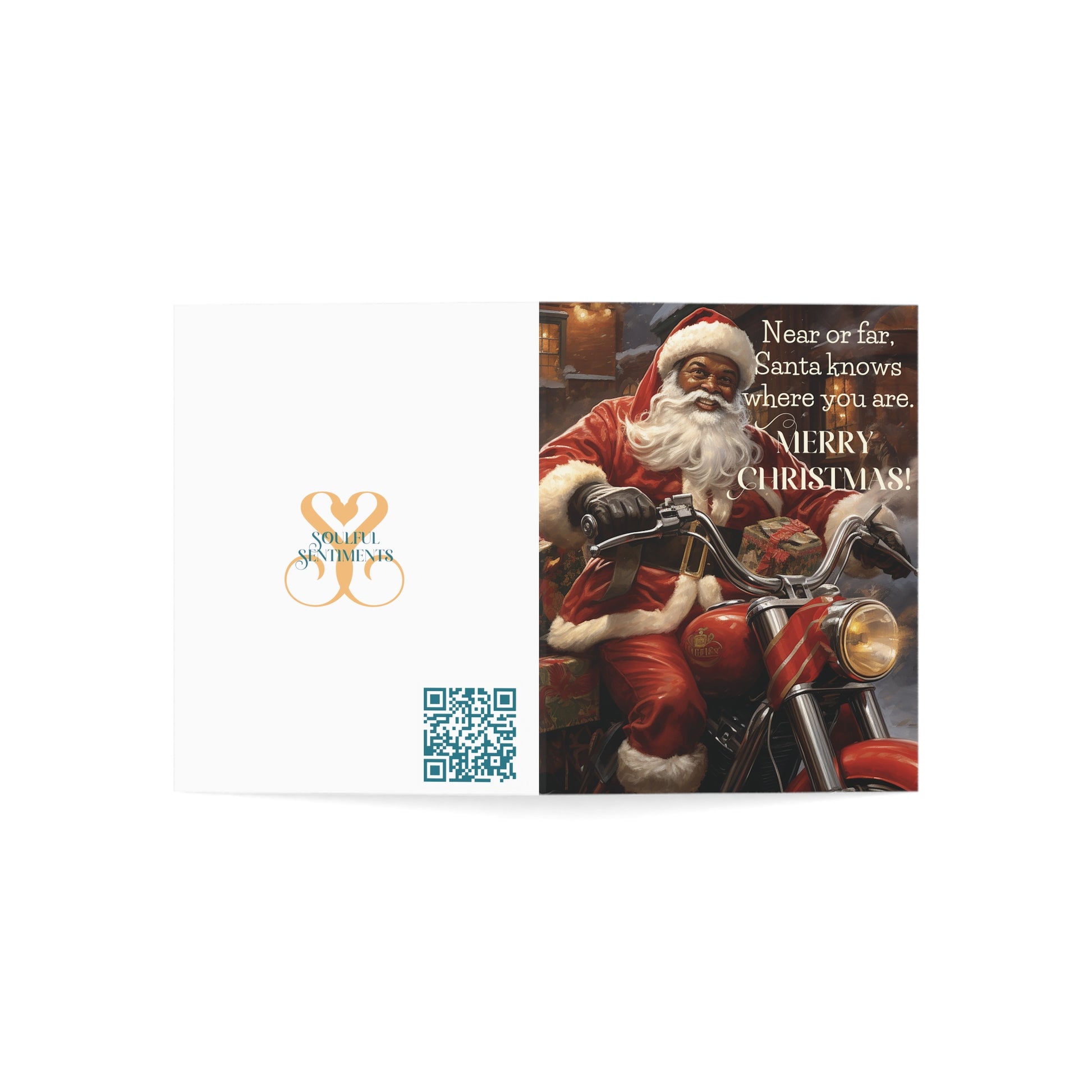 Gear up for festive cheer with our "Santa's Holiday Ride" Christmas card! On the front, Santa ditches his classic sleigh for a roaring motorcycle, embodying the perfect blend of tradition and adventure. As he rides with gusto, the card proudly proclaims, "Near or Far, Santa Knows Where You Are. Merry Christmas," assuring that the holiday spirit reaches every corner of the world. This card is a delightful blend of fun and sentiment, reminding recipients that no matter the distance, Santa—and the joy of Christmas—always finds a way. Send a dash of excitement and warmth this festive season with this whimsical greeting!