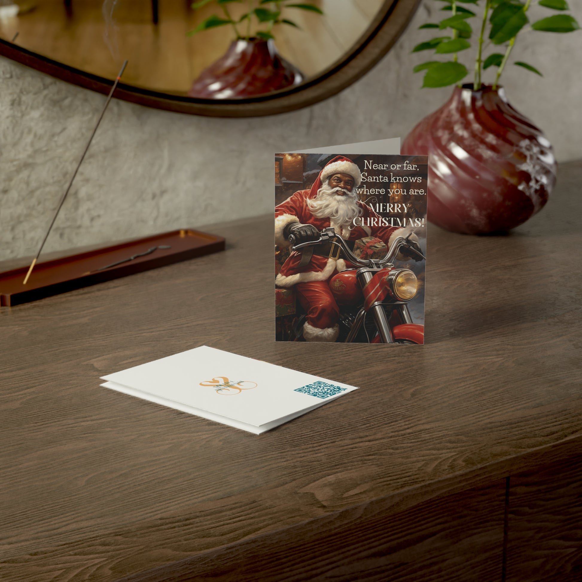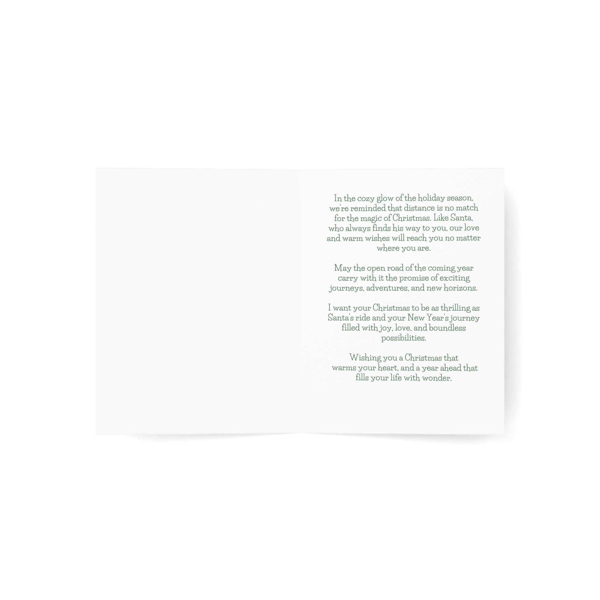 Gear up for festive cheer with our "Santa's Holiday Ride" Christmas card! On the front, Santa ditches his classic sleigh for a roaring motorcycle, embodying the perfect blend of tradition and adventure. As he rides with gusto, the card proudly proclaims: "Near or Far, Santa Knows Where You Are. Merry Christmas," assuring that the holiday spirit reaches every corner of the world. This card is a delightful blend of fun and sentiment, reminding recipients that no matter the distance, Santa—and the joy of Christmas—always finds a way. Send a dash of excitement and warmth this festive season with this whimsical greeting!