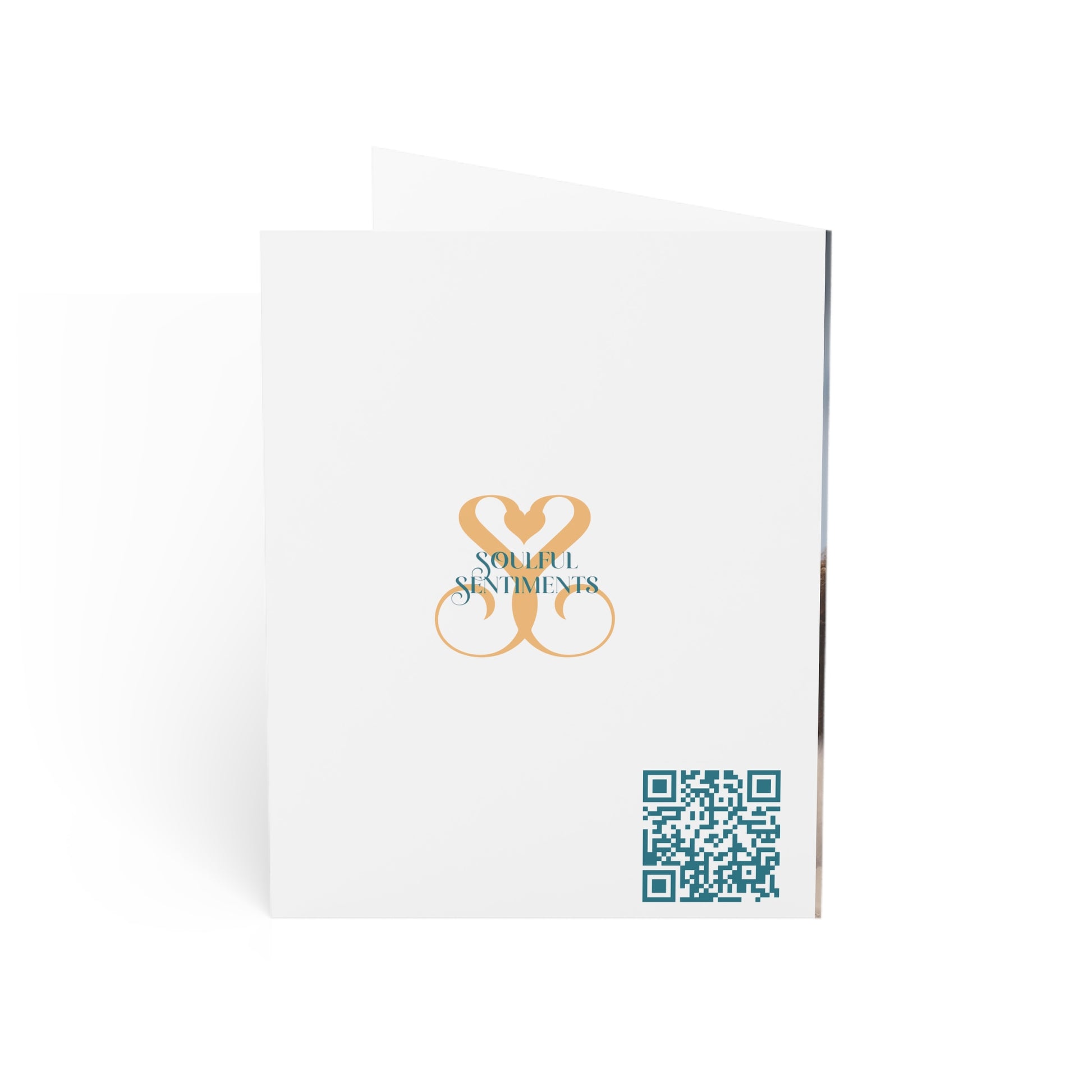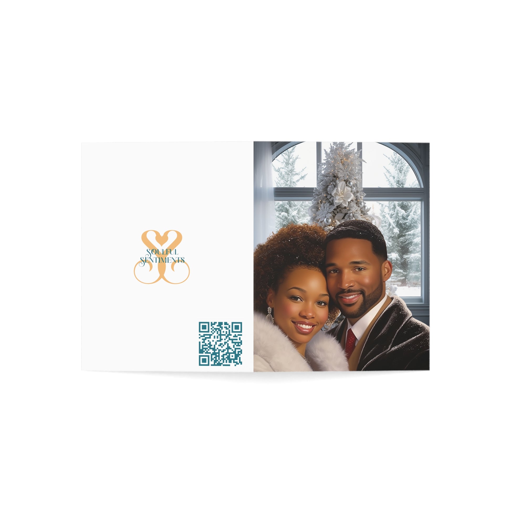 Experience the magic of the season with our "Snowy Serenade" Christmas card. The front showcases an intimate moment between an African American couple, their joy and love palpable as they stand united, bathed in the soft glow of a pristine white Christmas tree. The backdrop reveals a window framing a tranquil snow-covered landscape, evoking feelings of peace and wonder. This card beautifully merges indoor warmth with outdoor winter beauty, creating a timeless scene that speaks of love, unity, and the enchanting spirit of Christmas. It's more than just a greeting; it's a moment captured in time, perfect for sharing with those you hold dear.