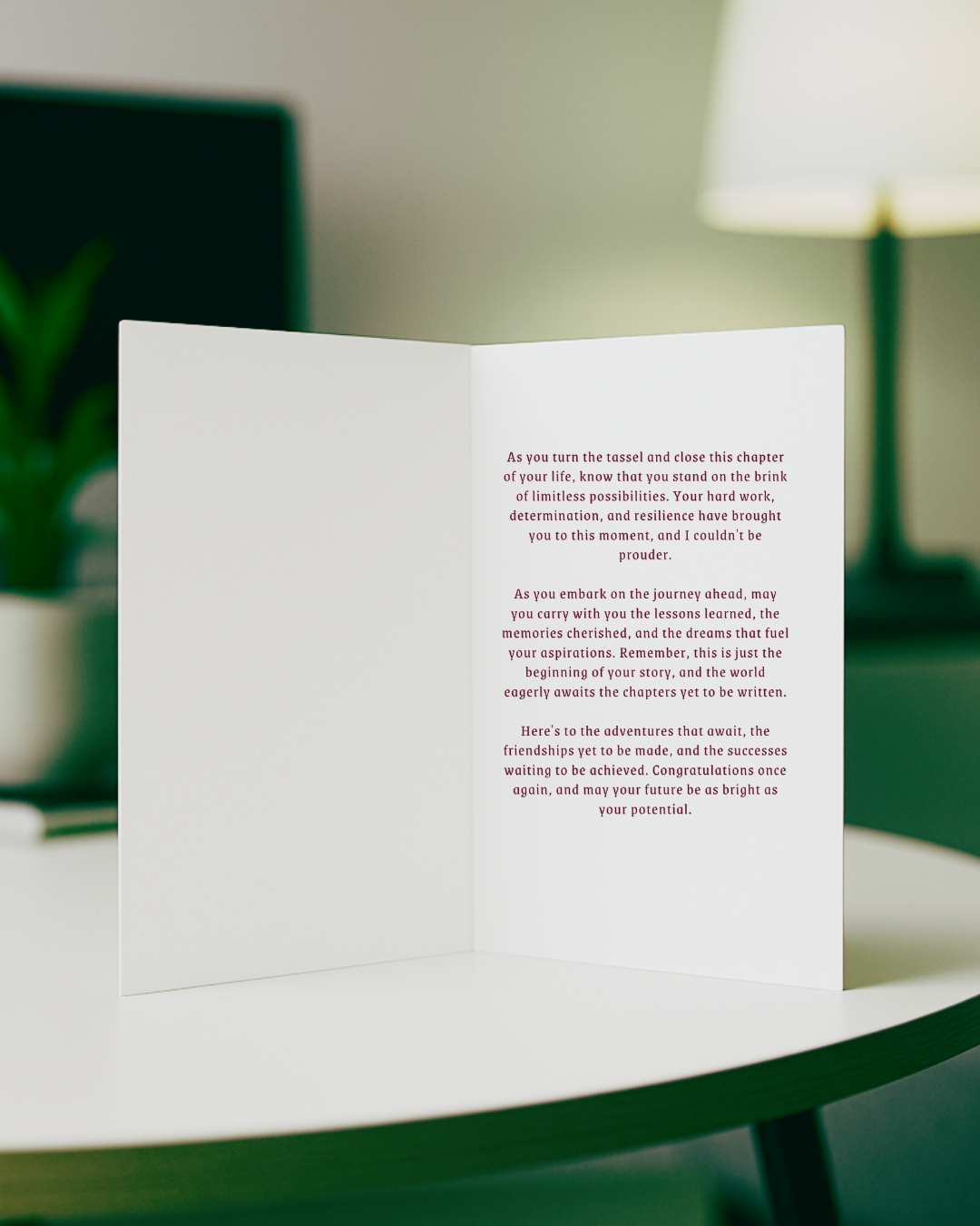 Celebrate this pivotal moment with Turn The Tassel, a meaningful way to honor academic achievement and the exciting journey ahead. Marking graduation day and recognizing scholarly dedication with this thoughtful piece captures the pride of reaching this big milestone. It's a perfect way to acknowledge hard work, resilience, and the courage to embrace new adventures. Give the thought that says, "I'm proud of you," and inspires confidence as they step boldly into their next chapter of greatness.