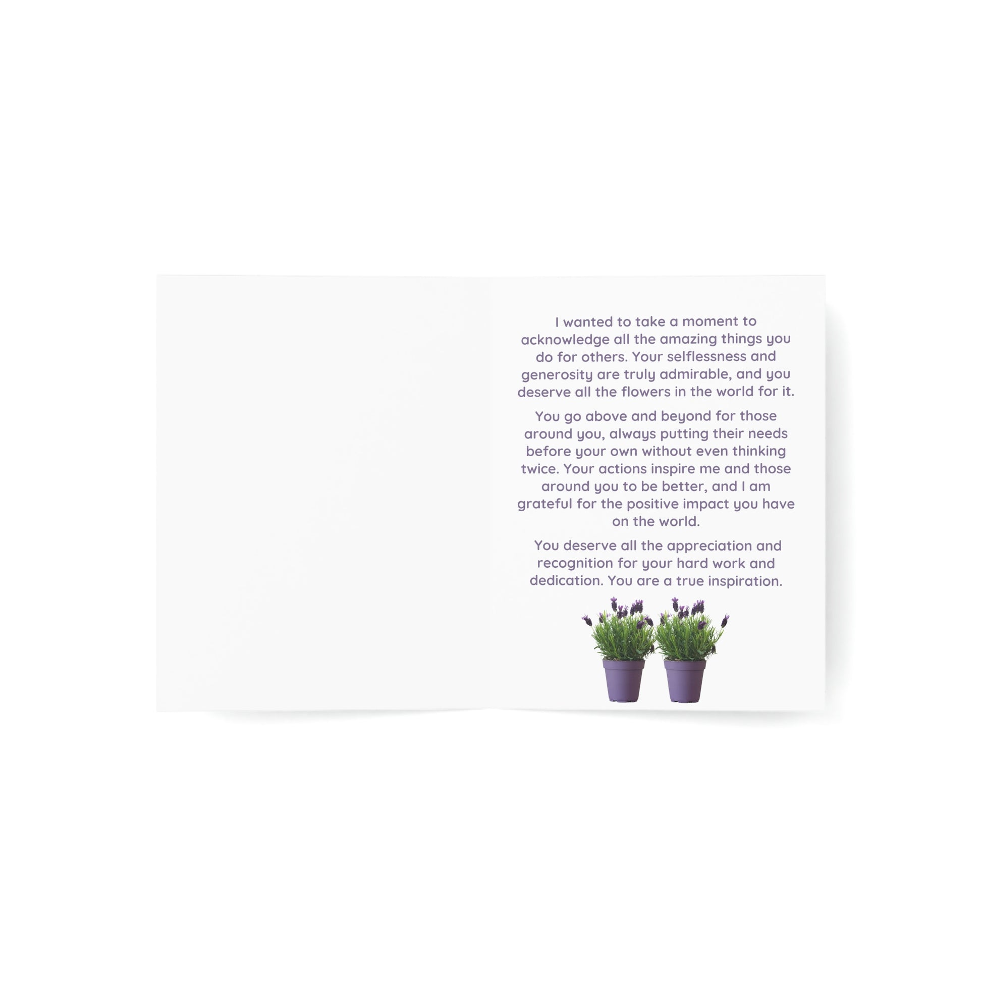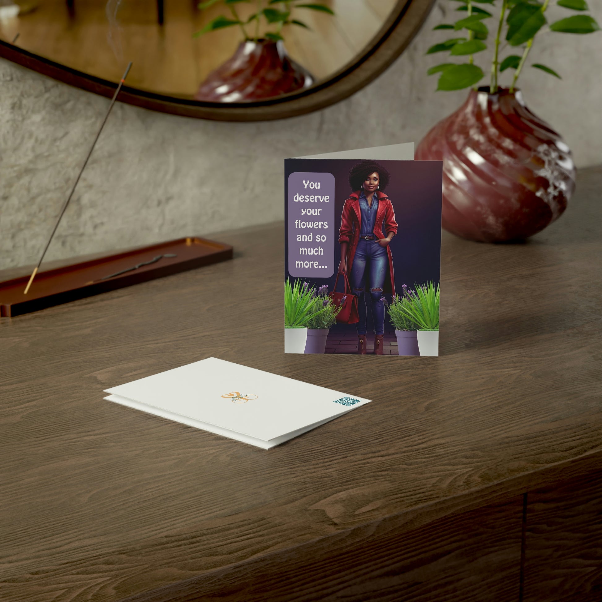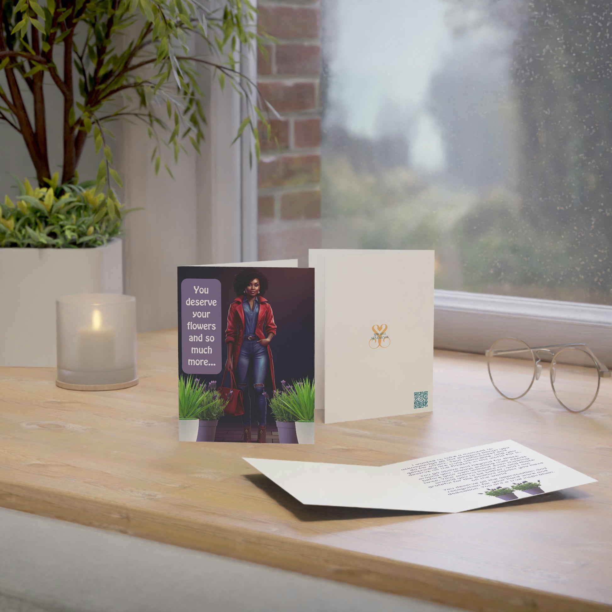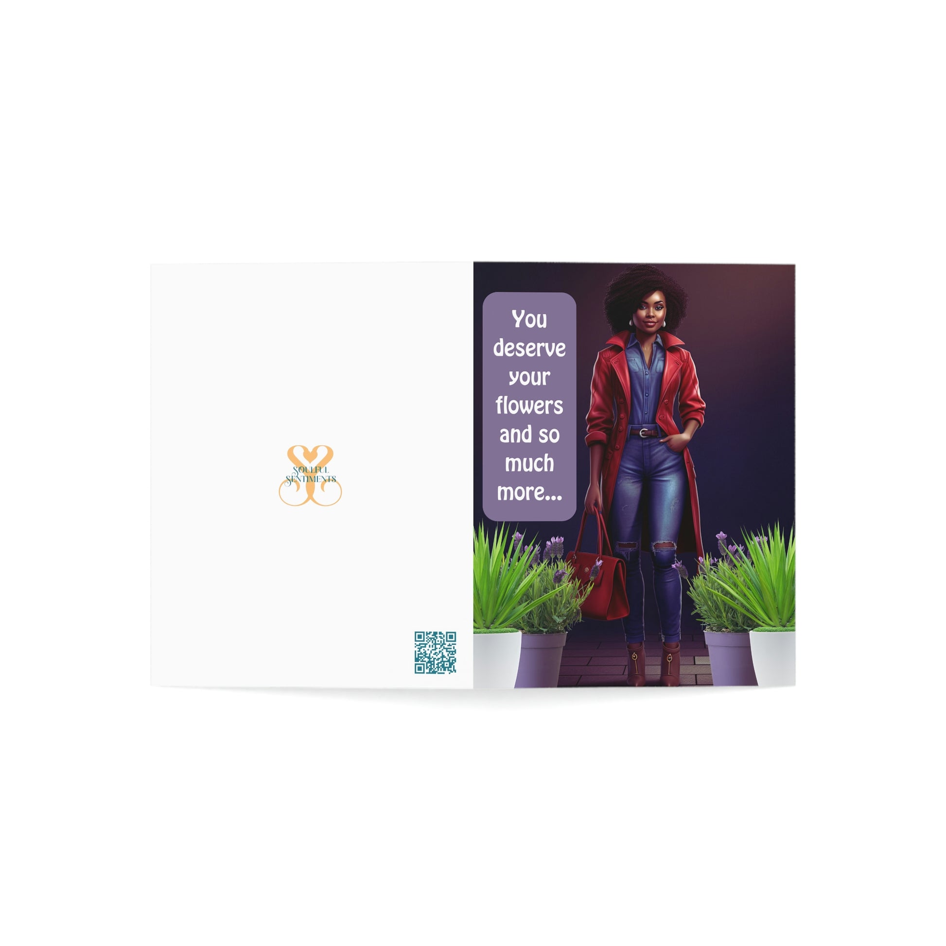 Looking for the perfect way to show a special woman in your life how much you appreciate her? Look no further than our "You Deserve Your Flowers" greeting card!